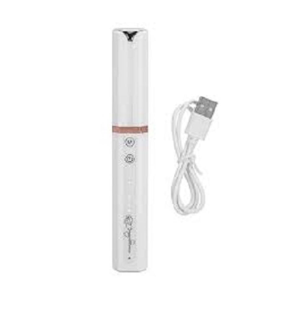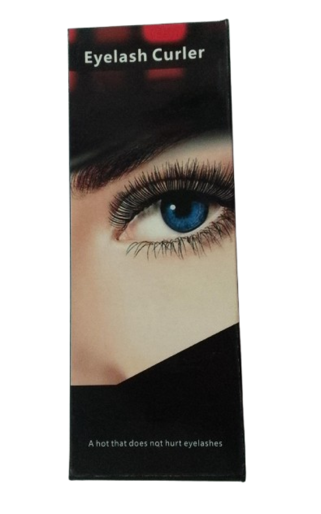 جهاز صغير الحجم لتجعيد الرموش بالحرارة. الجهاز باللون الأسود وله تصميم نحيف يشبه القلم. يحتوي على رأس مسخن مزود بأسنان صغيرة لتجعيد الرموش. يوجد على جسم الجهاز أزرار للتحكم في التشغيل والوظائف الأخرى. يظهر في الصورة امرأة تستخدم الجهاز على رموشها، مما يؤكد وظيفته.